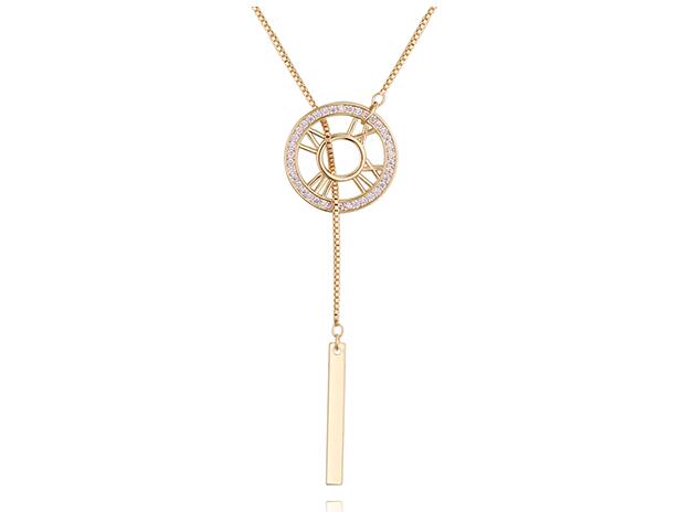 Original collar en baño de oro amarillo de 18 quilates, diseño de circulo con numeros romanos e incrustraciones de cristales en color blanco. Fabricado en una estructura de aleación de platino con rodio sin níquel.