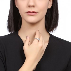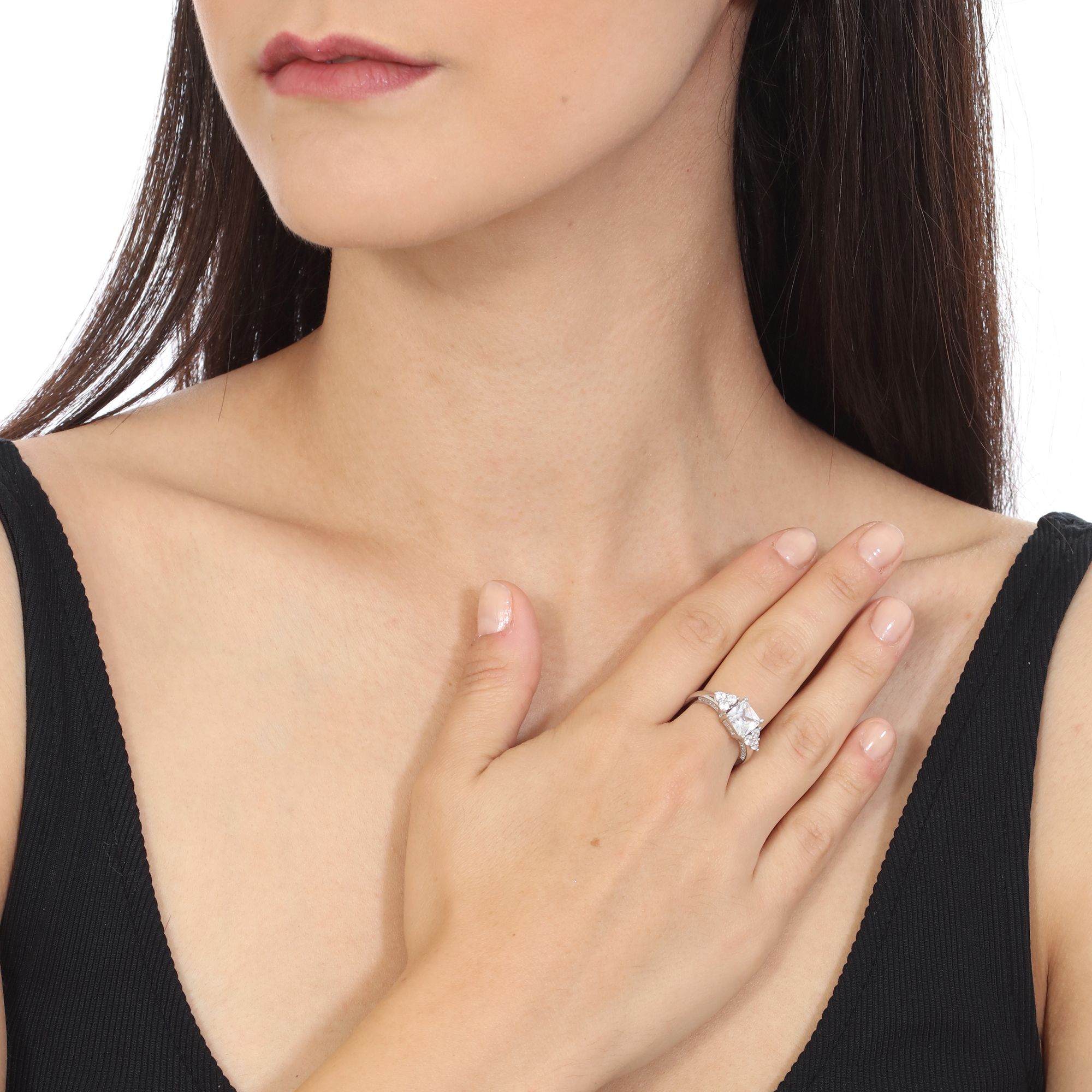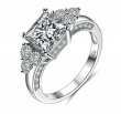 Elegante anillo en baño de oro blanco de 18 quilates, fino diseño, con cristal blanco corte princesa e incrustaciones de cristales en color blanco. Fabricado en una estructura de aleación de platino con rodio sin níquel.