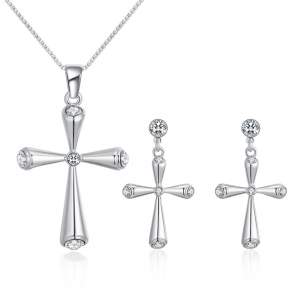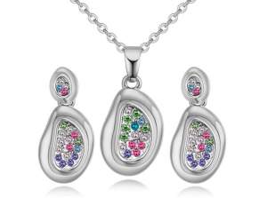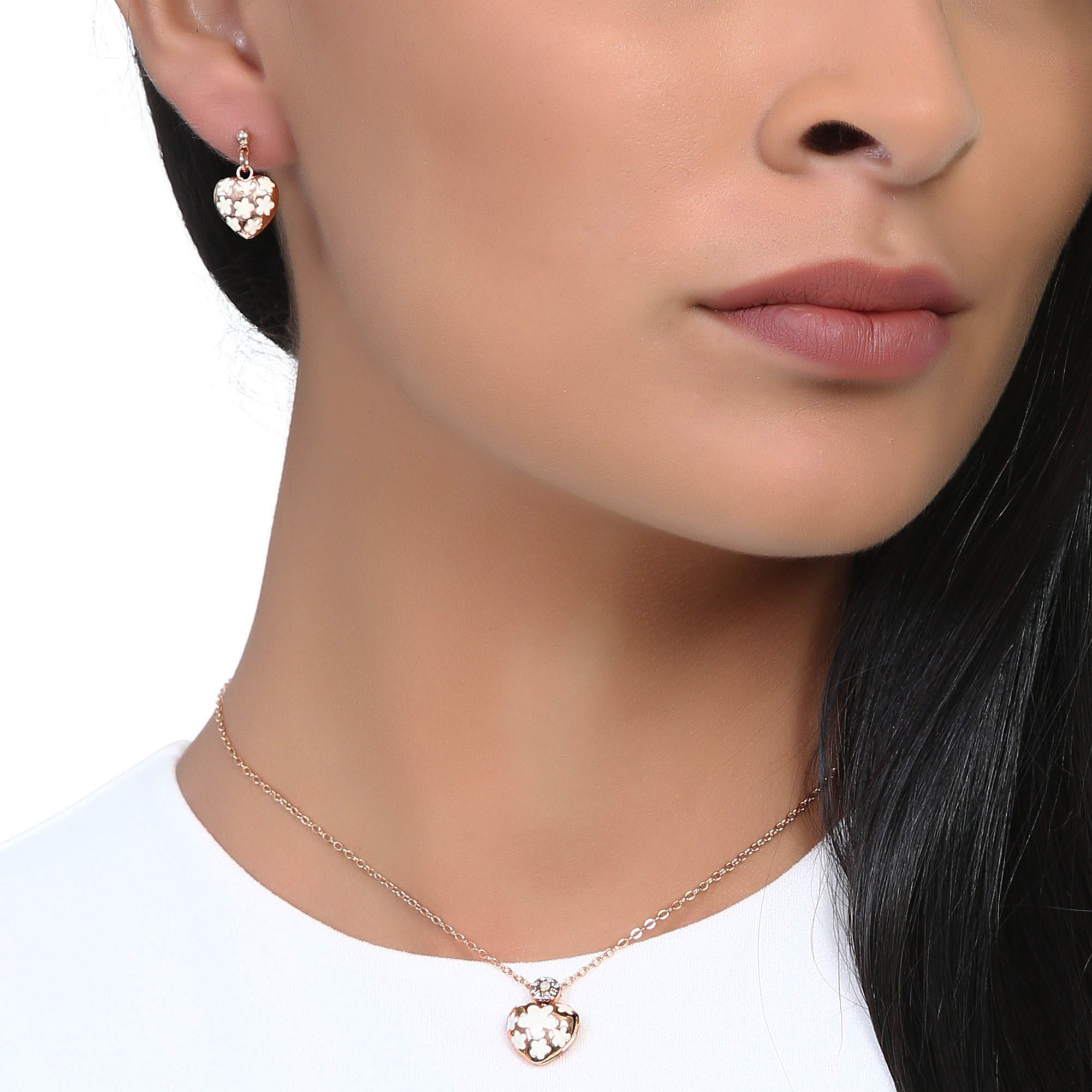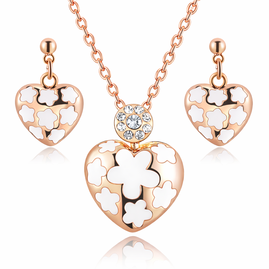 Hermoso juego de aretes y dije con cadena en baño de oro rosa de 18 quilates, diseño de corazón con flores esmaltadas en blanco e incrustaciones de cristales blancos. Fabricado en una estructura de aleación de platino con rodio sin níquel.