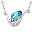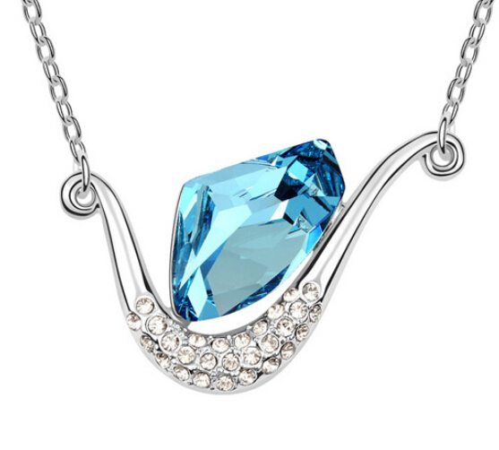 Collar en baño de oro blanco de 18 quilates, fino diseño de curva con incrustaciones de cristales en color blanco y cristal azul. Fabricado en una estructura de aleación de platino con rodio sin níquel.