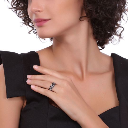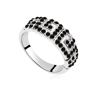 Delicado anillo en baño de oro blanco de 18 quilates, diseño de grecas con incrustaciones de cristales en color negro.