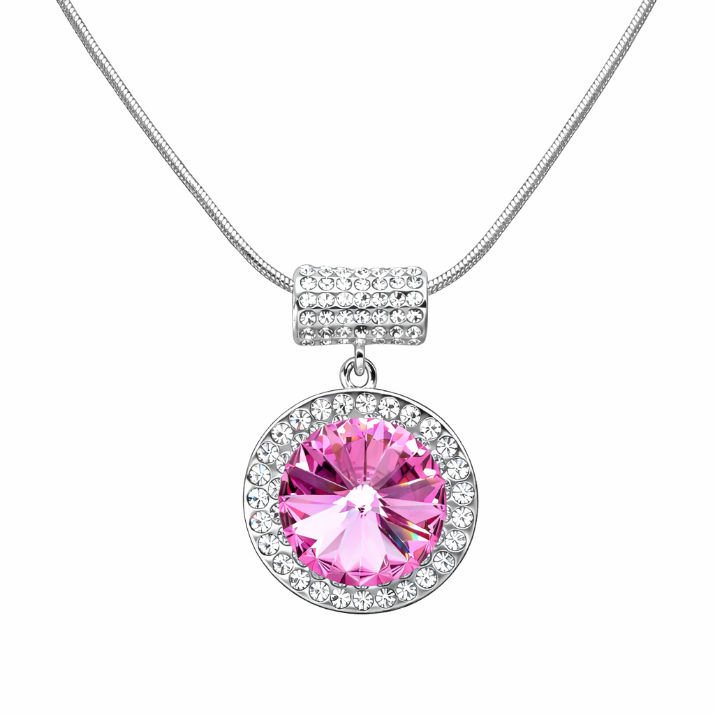 Dije con cadena en baño de oro blanco de 18 quilates, diseño de circulo con incrustaciones de cristales en color blanco y rosa. Fabricado en una estructura de aleación de platino con rodio sin níquel.