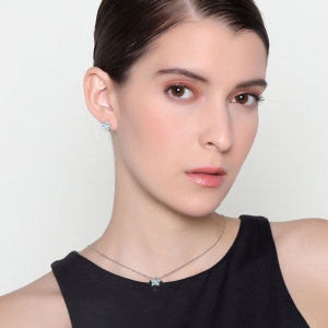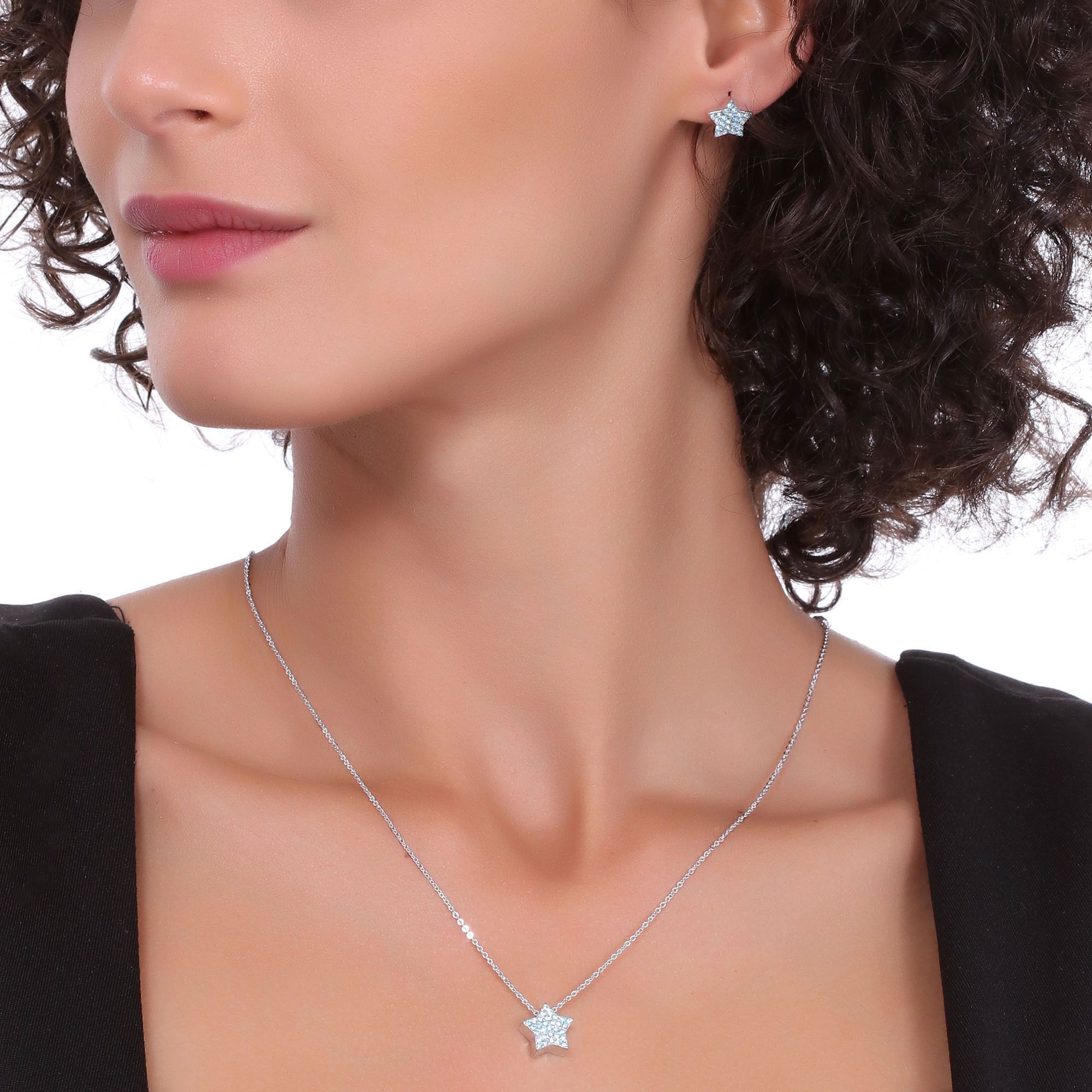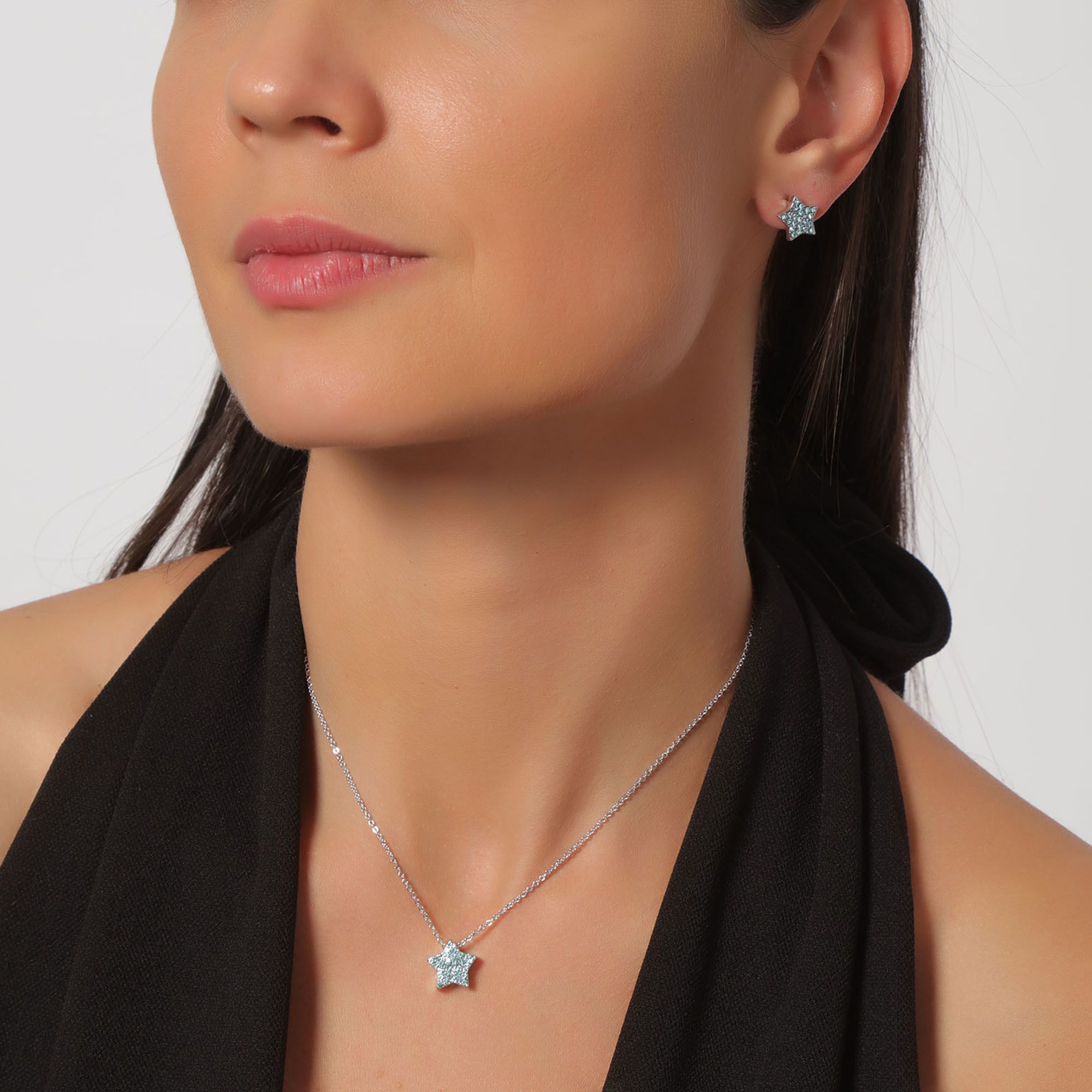 Hermoso juego de aretes y dije en baño de oro blanco de 18 quilates, diseño de estrellas con incrustaciones de cristales en color azul. Fabricado en una estructura de aleación de platino con rodio sin níquel.