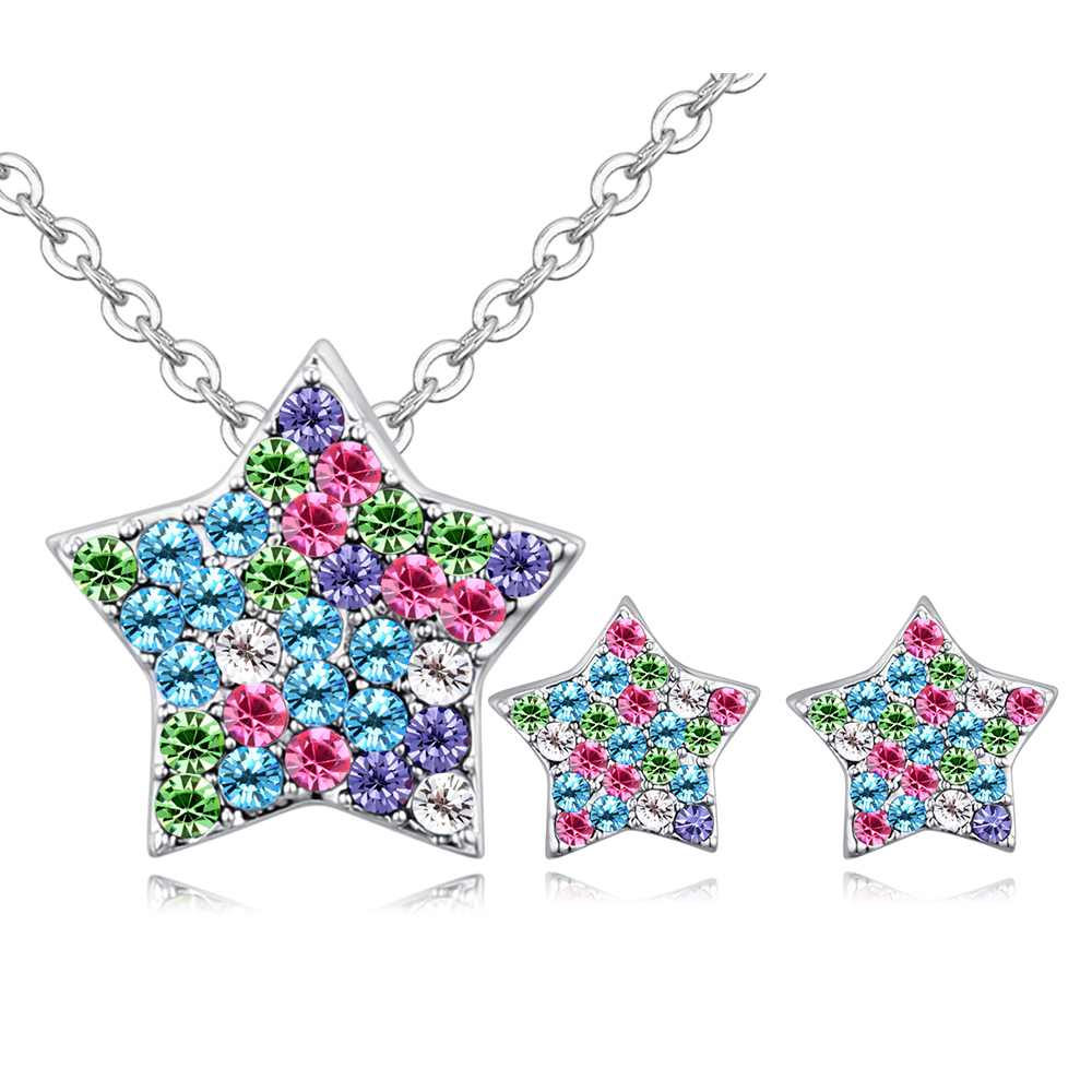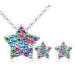 Juego de aretes y dije en baño de oro blanco de 18 quilates, diseño de estrellas con incrustaciones de cristales en colores verde, azul, lila y rosa. Fabricado en una estructura de aleación de platino con rodio sin níquel.