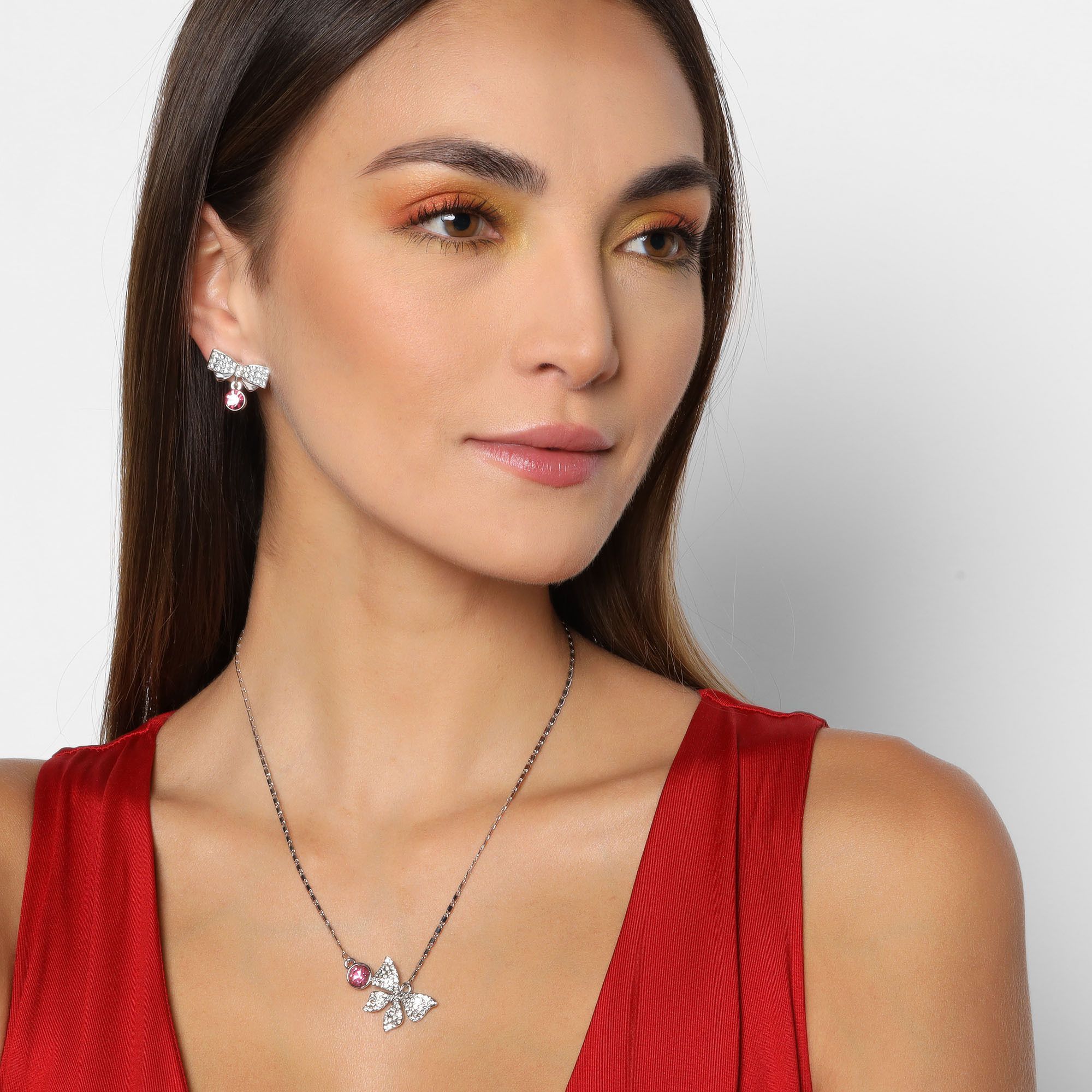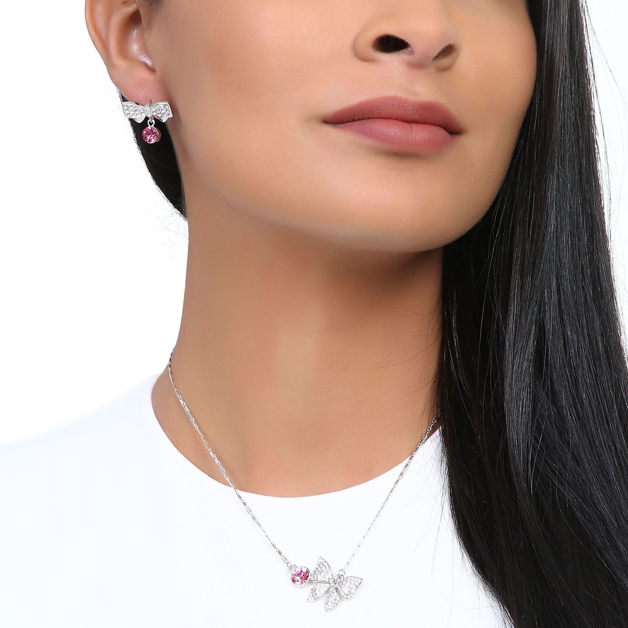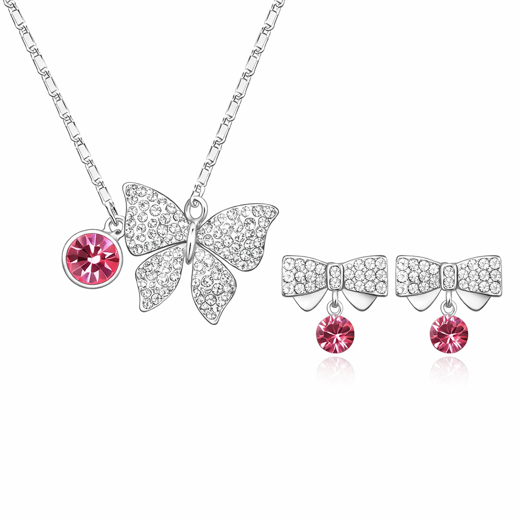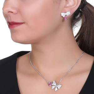 Juego de aretes y collar en baño de oro blanco de 18 quilates, diseño de moño y mariposa con cristales rosas corte brillante e incrustaciones de cristales blancos. Fabricado en una estructura de aleación de platino con rodio sin níquel.