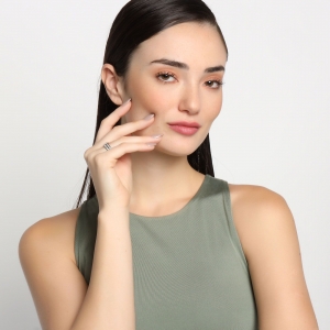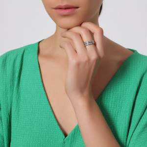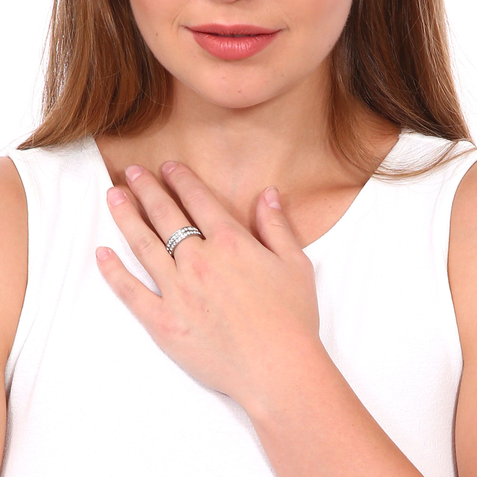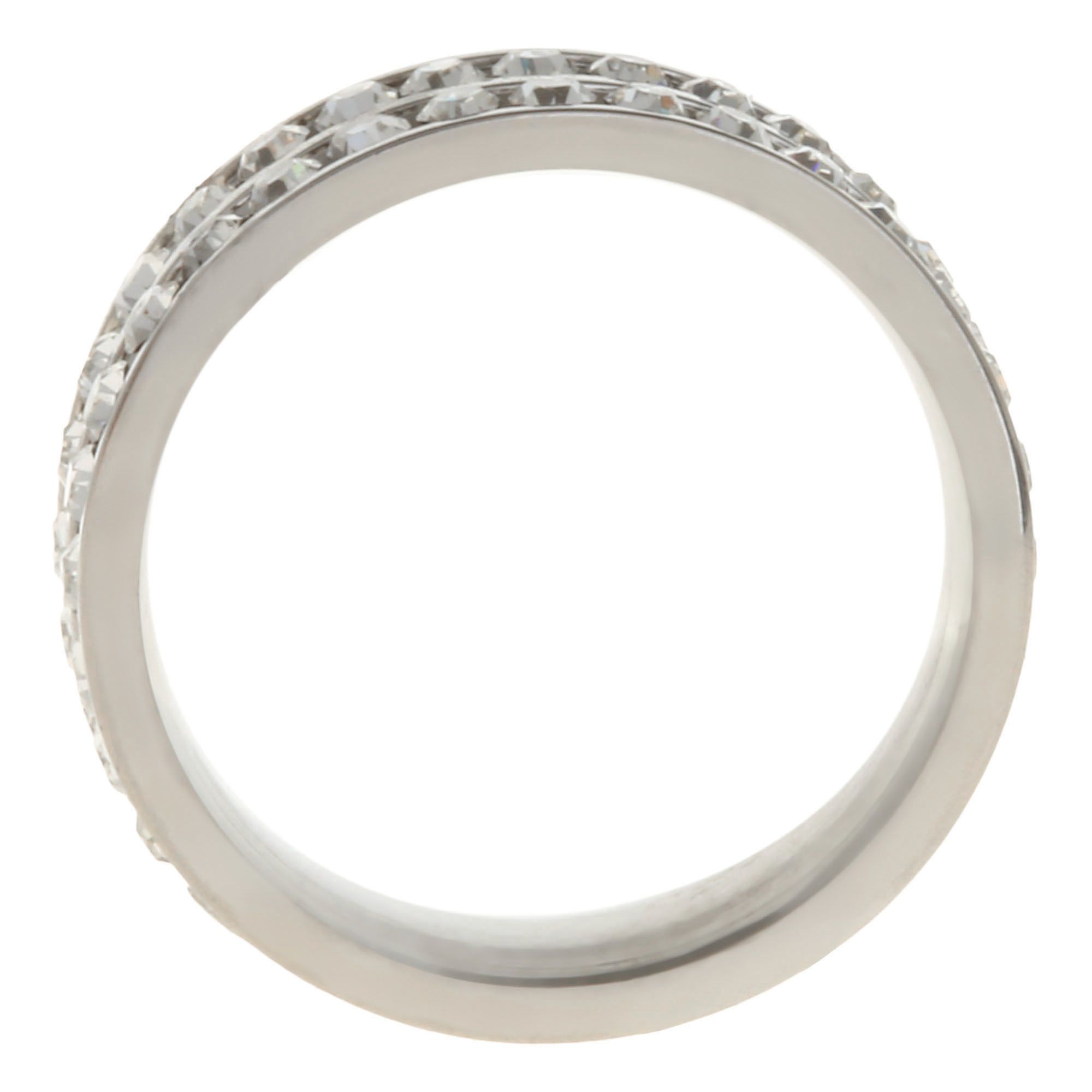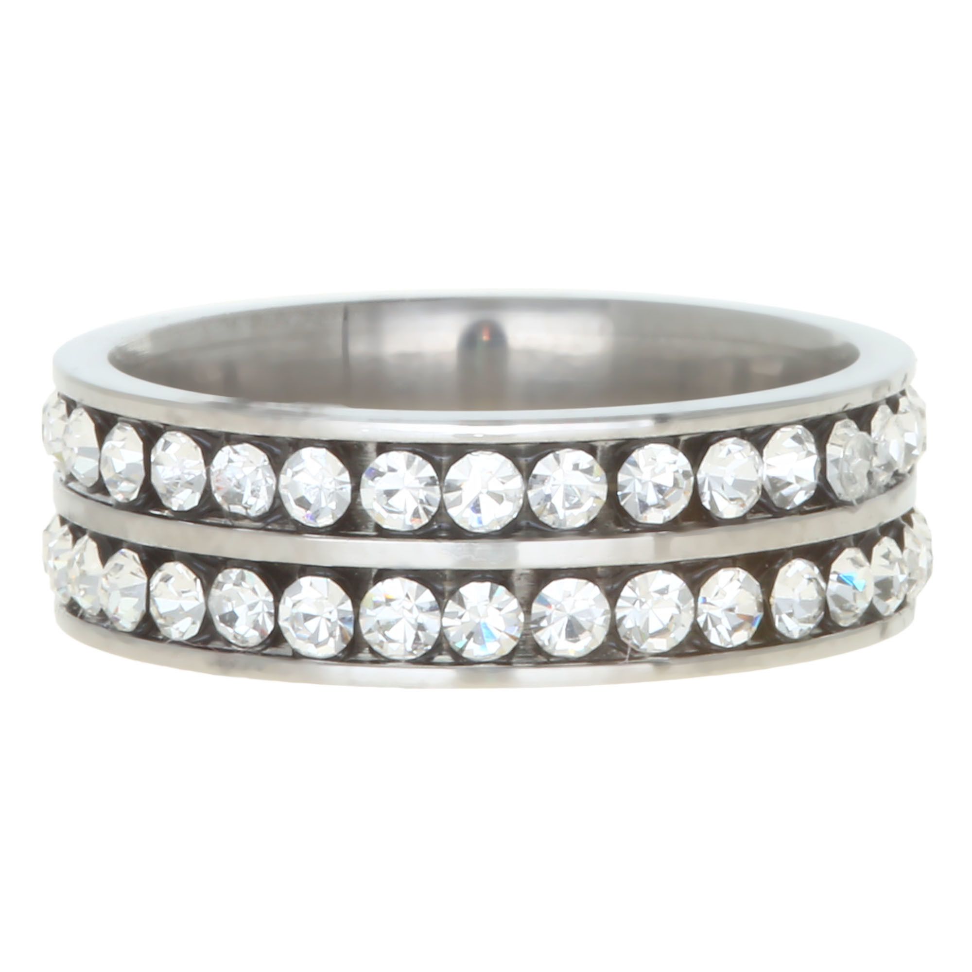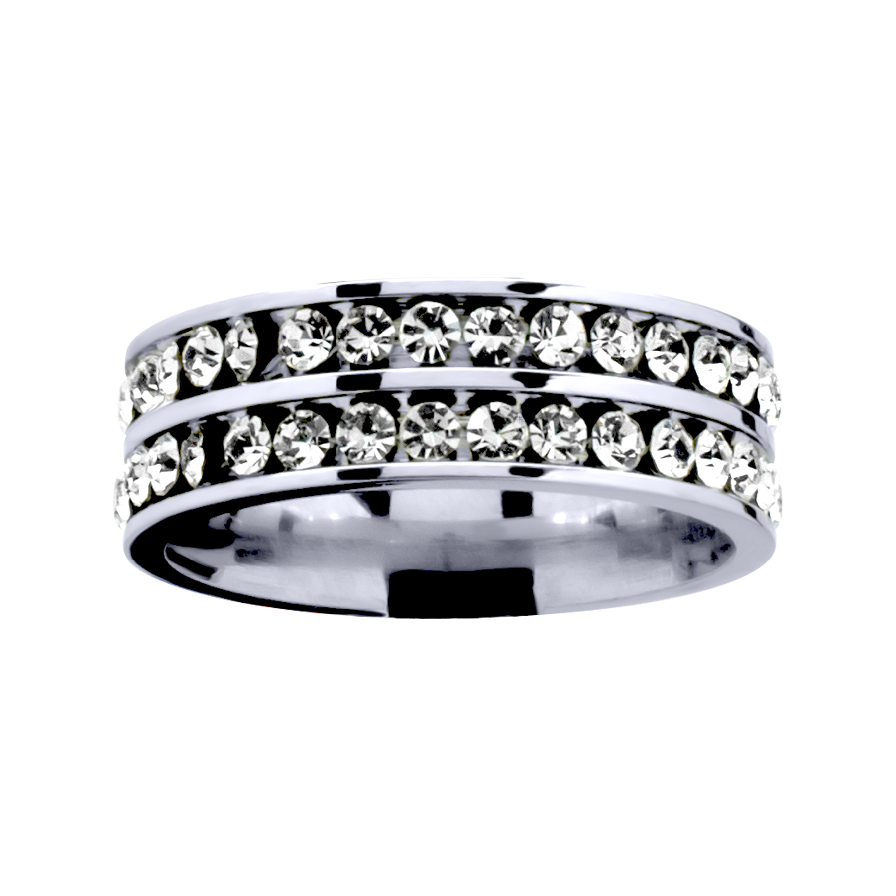 Lindo anillo en color plata, fino diseño con doble hilera de cristales en color blanco. Fabricado en acero inoxidable.