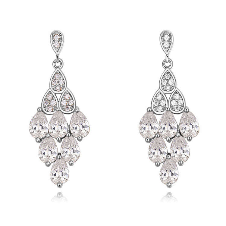 Hermosos aretes en baño de oro blanco de 18 quilates, diseño de cascada con incrustaciones de cristales en color blanco. Fabricado en una estructura de aleación de platino con rodio sin níquel.
