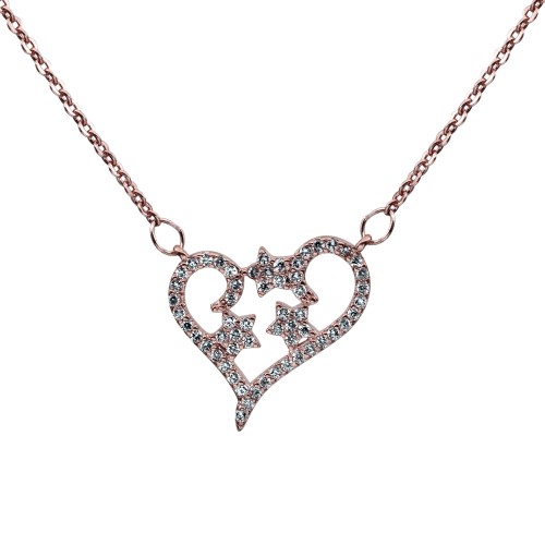 Elegante collar en baño de oro rosa de 18 quilates, diseño de corazón con estrellas e incrustraciones de cristales en color blanco. Fabricado en una estructura de aleación de platino con rodio sin níquel.