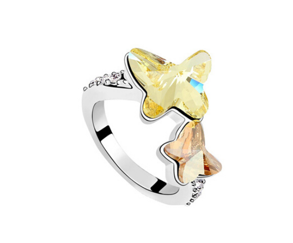 Anillo en baño de oro blanco de 18 quilates , diseño de mariposa con incrustaciones de cristales en color ámbar, blanco y amarillo.