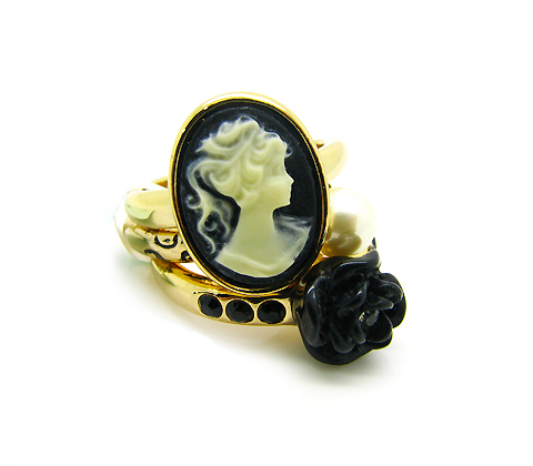Anillo en baño de oro amarillo de 18 quilates , diseño de ovalo con camafeo al centro, detalle de rosas en tono negro y blanco e incrustaciones de cristales negros.