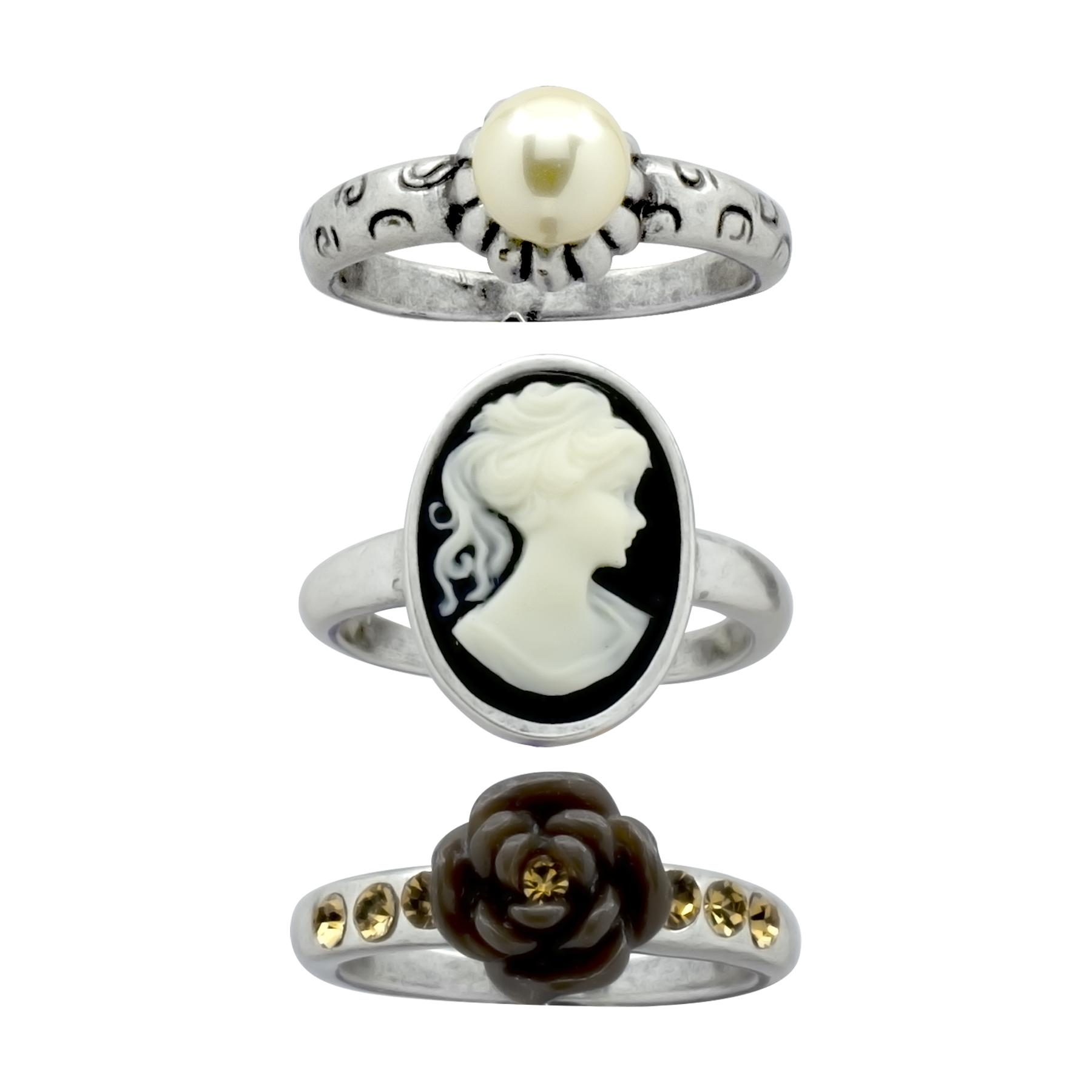 Elegante anillo, en baño de oro blanco de 18 quilates, diseño de triple anillo, en el primero un camafeo de cristal opaco color negro con blanco, en el segundo una rosa café de cristal con incrustaciones de cristales en color ámbar y el ultimo con perla blanca y delicados grabados. Fabricado en una estructura de aleación de platino con rodio sin níquel.
