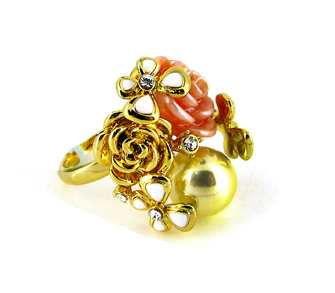 Bello anillo, en baño de oro amarillo de 18 quilates, con rosa de cristal color coral, rosa dorada, perla dorada, mariposas esmaltadas en blanco e incrustaciones de cristales blancos. Fabricado en una estructura de aleación de platino con rodio sin níquel.