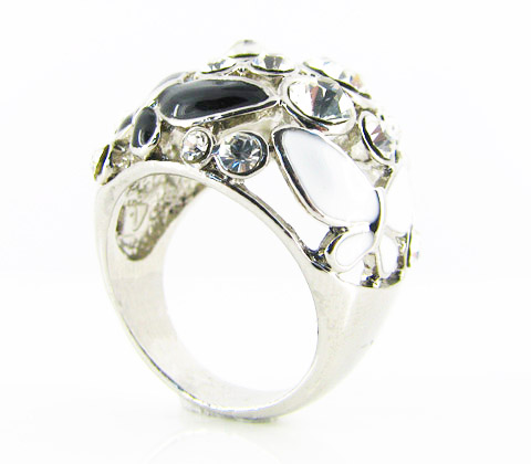 Precioso anillo, en baño de oro blanco de 18 quilates, con detalles de mariposas esmaltadas en color blanco y negro, e incrustaciones de cristales blancos. Fabricado en una estructura de aleación de platino con rodio sin níquel.