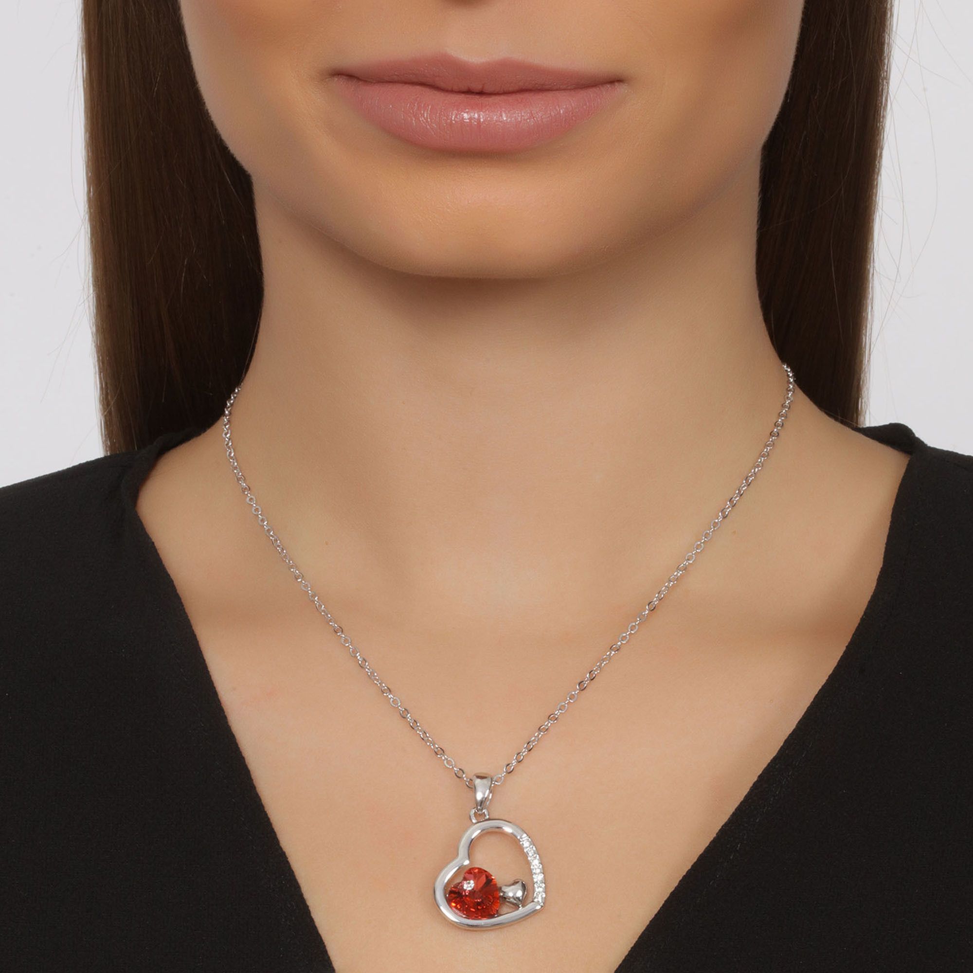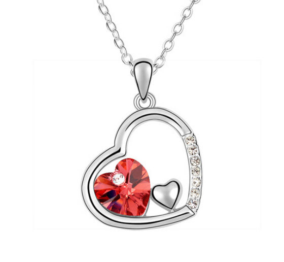 Lindo dje en baño de oro blanco de 18 quilates, fino diseño de corazones con incrustaciones de cristales en color blanco y rojo. Fabricado en una estructura de aleación de platino con rodio sin níquel.
