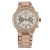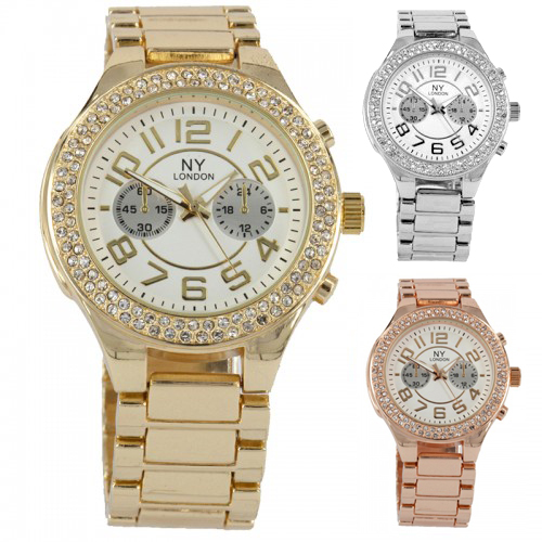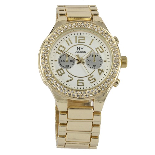Elegante reloj NY, en baño de oro de 18 quilates, disponible en oro amarillo, blanco y rosa, con incrustaciones de cristales en color blanco. Fabricado en una estructura de aleación de platino con rodio sin níquel.