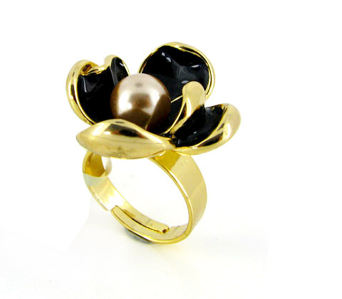 Bonito anillo en baño de oro amarillo de 18 quilates, diseño de flor esmaltada en color negro y perla color bronce.