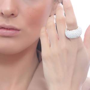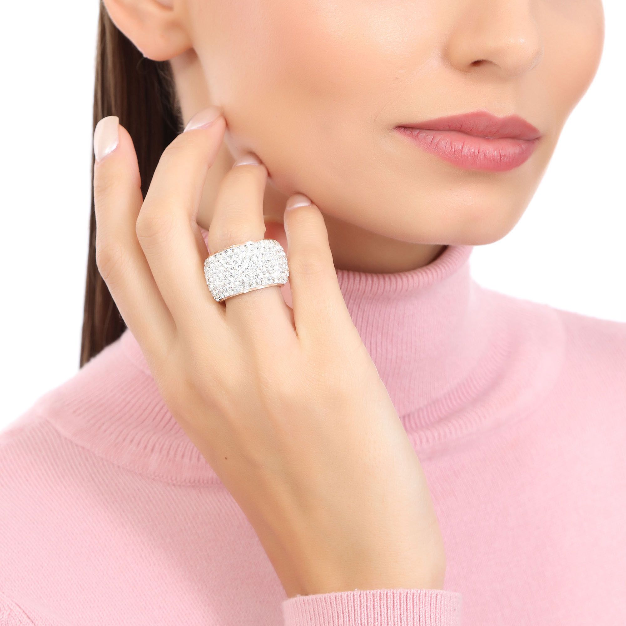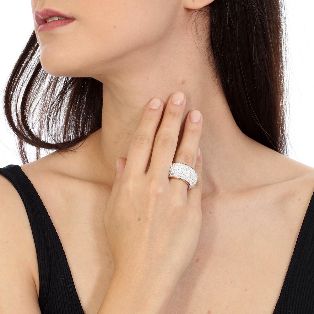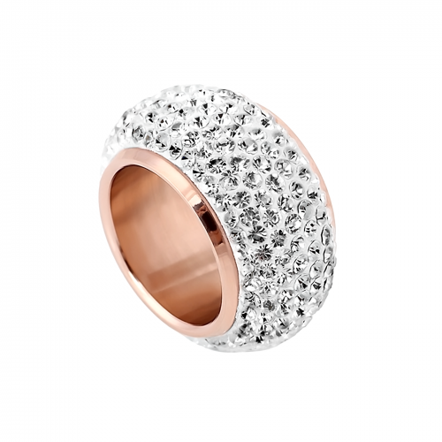 Anillo de acero inoxidable color rosa, diseño convexo, con incrustaciones de cristales en color blanco.