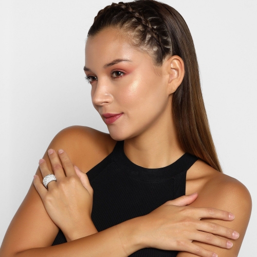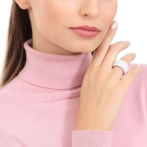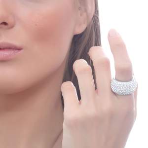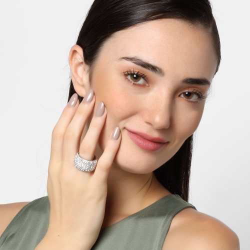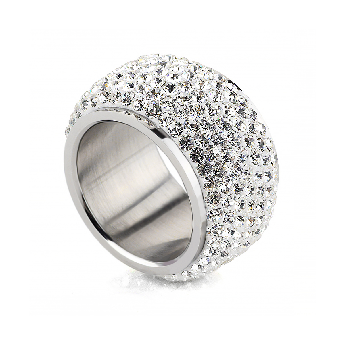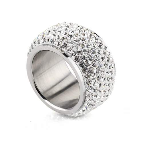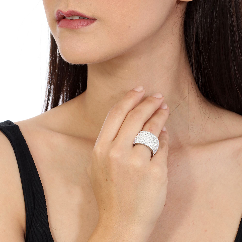 Anillo de acero inoxidable en color plateado, diseño convexo con incrustaciones de cristales blancos.
