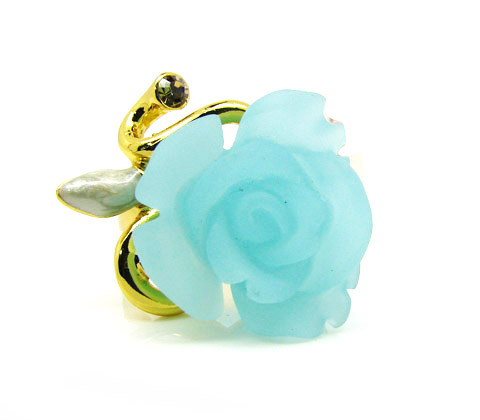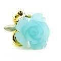 Fino anillo, en baño de oro amarillo de 18 quilates, con rosa azul aqua, toque nacarado e incrustación de cristal humo. Fabricado en una estructura de aleación de platino con rodio sin níquel.