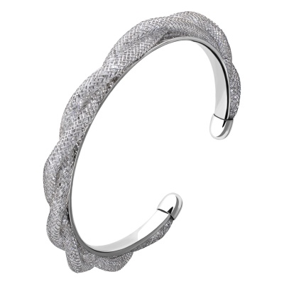Lindo brazalete en baño de oro blanco de 18 quilates, diseño de red entrelazada con cristales dentro en color blanco. Fabricado en una estructura de aleación de platino con rodio