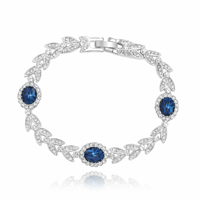 Hermoso brazalete en baño de oro blanco de 18 quilates, elegante diseño de hojas con cristales color zafiro corte oval e incrustaciones de cristales blancos. Fabricado en una estructura de