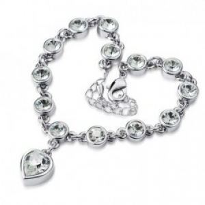 Brazalete en baño de oro blanco de 18 quilates, elegante diseño con dije de gota e incrustaciones de cristales en color blanco. Fabricado en una estructura de aleación de platino