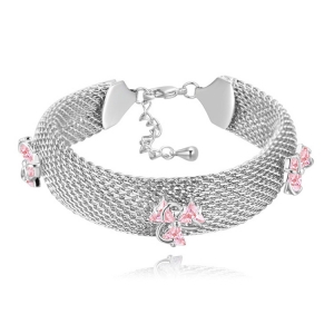 Brazalete de red en baño de oro blanco de 18 quilates, diseño de flores con incrustaciones de cristales en color rosa. Fabricado en una estructura de aleación de platino con