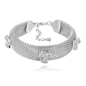 Brazalete de red en baño de oro blanco de 18 quilates, diseño de flores con incrustaciones de cristales en color blanco. Fabricado en una estructura de aleación de platino con