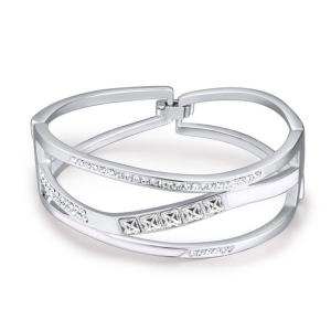 Brazalete en baño de oro blanco de 18 quilates, diseño cruzado con esmaltado blanco e incrustaciones de cristales en color blanco. Fabricado en una estructura de aleación de platino con