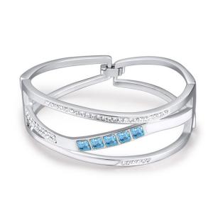 Hermoso brazalete en baño de oro blanco de 18 quilates, elegante diseño entrelazado con incrustraciones de cristales en color azul. Fabricado en una estructura de aleación de platino con rodio sin