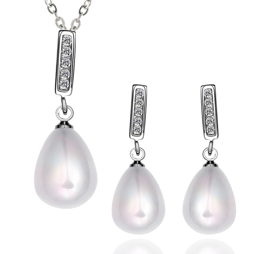 Hermoso juego de aretes y dije en baño de oro blanco de 18 quilates, elegante diseño con gotas de perlas blancas y detalles plateados con incrustaciones de cristales blancos. Fabricado en una estructura de aleación de platino con rodio sin níquel.