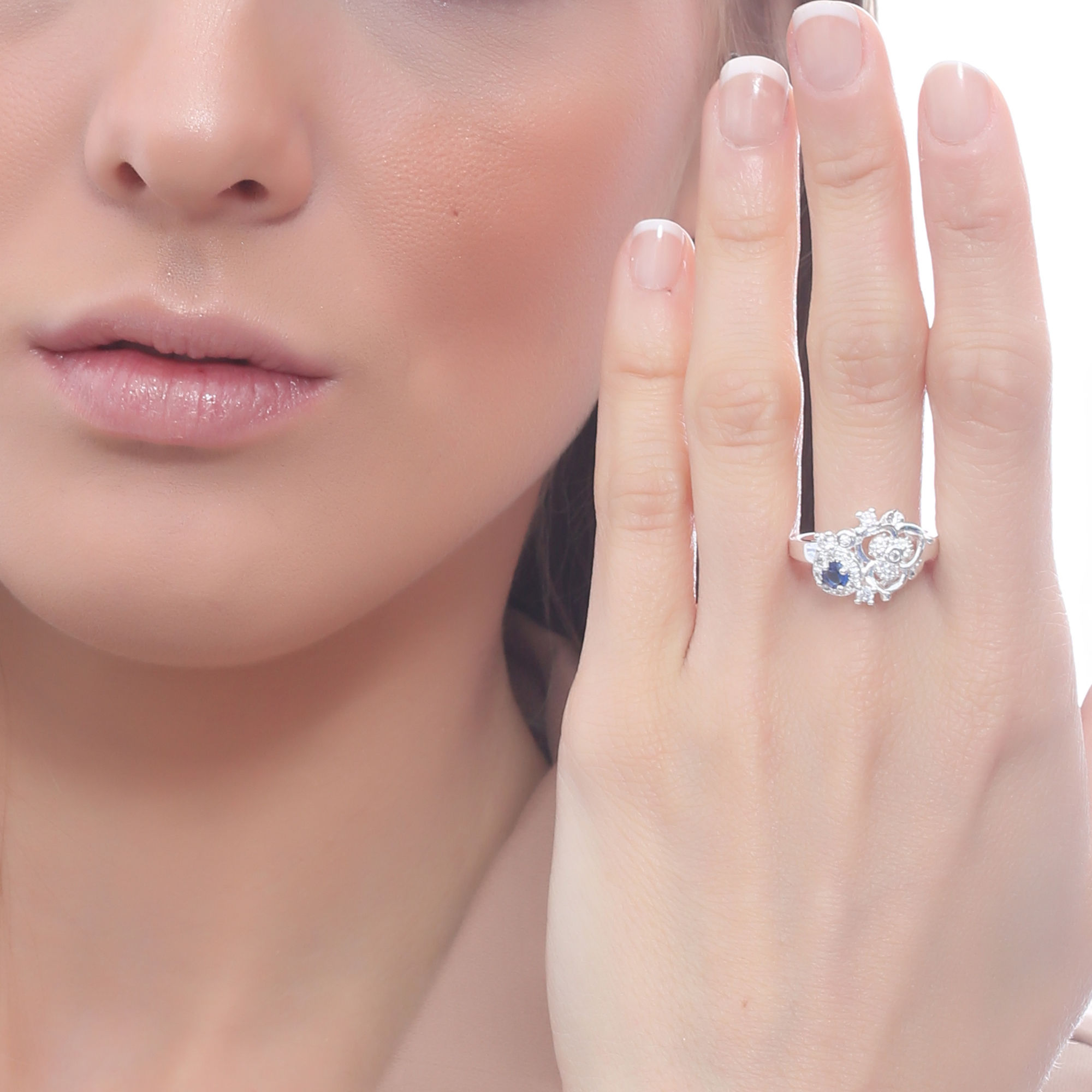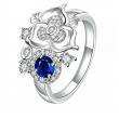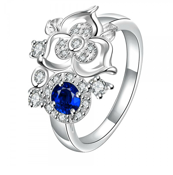 Exclusivo anillo de Plata Ley 925, diseño de flor, con cristal azul zafiro corte brillante e incrustaciones de cristales blancos.