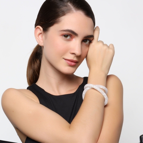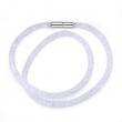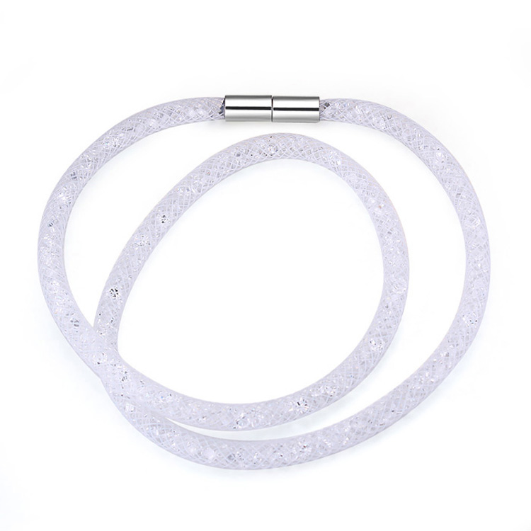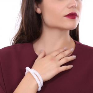 Hermoso brazalete doble vuelta, de malla blanca, con cristales dentro en color blanco y broche de imán. Fabricado en una estructura de aleación de platino con rodio sin níquel.