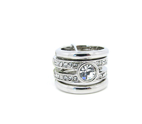 Fino anillo triple en baño de oro blanco de 18 quilates, con cristal blanco al centro e incrustaciones de cristales blancos. Fabricado en una estructura de aleación de platino con rodio sin níquel.