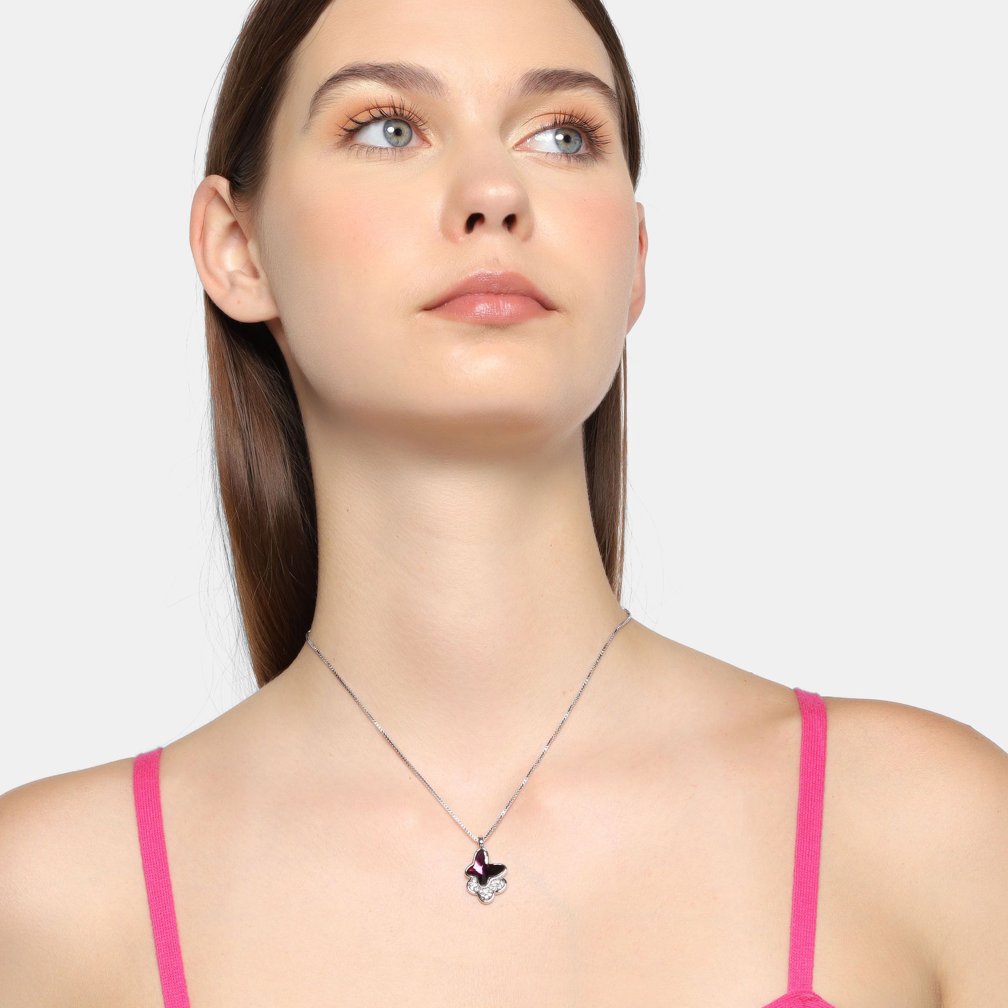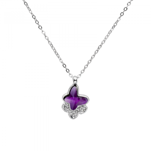 Precioso dije con cadena en baño de oro blanco de 18 quilates, diseño de mariposa de cristal púrpura e incrustaciones de critales blancos. Fabricado en una estructura de aleación de platino con rodio sin níquel.