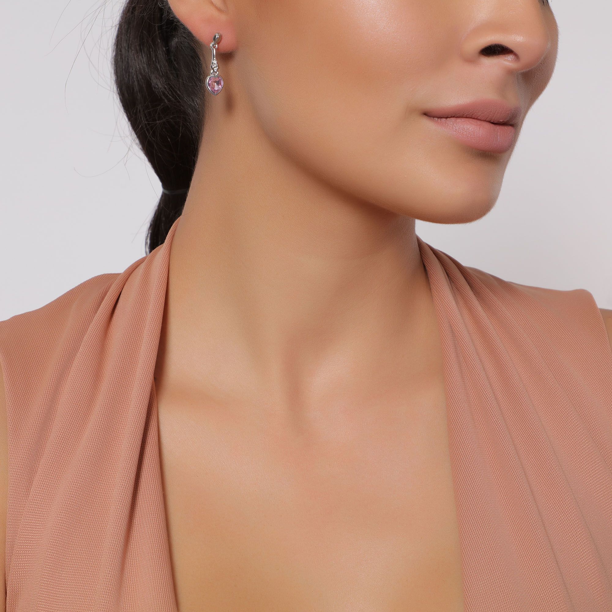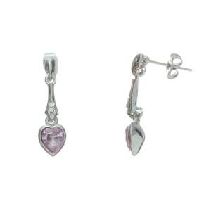 Lindos aretes en baño de oro blanco de 18 quilates, diseño de corazón con incrustaciones de cristales en color blanco y morado. Fabricado en una estructura de aleación de platino con rodio sin níquel.