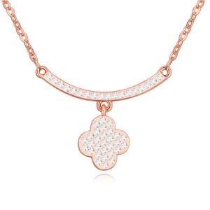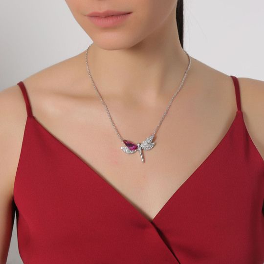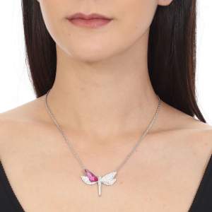 Collar en baño de oro blanco de 18 quilates, diseño de libélula con incrustaciones de cristales en color blanco y rosa. Fabricado en una estructura de aleación de platino con rodio sin níquel.