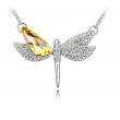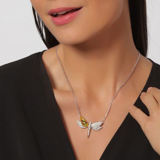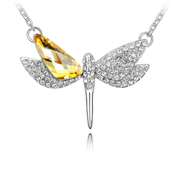 Collar en baño de oro blanco de 18 quilates, diseño de libélula con incrustaciones de cristales en color amarillo y blanco. Fabricado en una estructura de aleación de platino con rodio sin níquel.