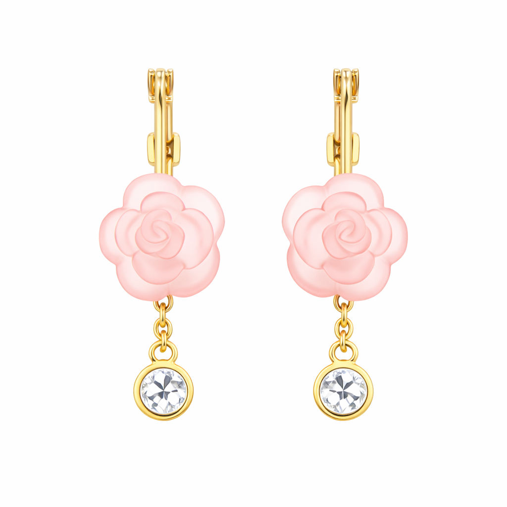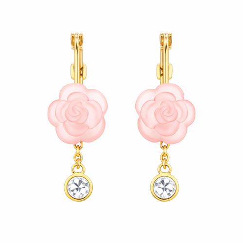 Bonitas arracadas en baño de oro amarillo de 18 quilates con flores de cristal rosa, e incrustaciones de cristales blancos. Fabricado en una estructura de aleación de platino con rodio sin níquel.