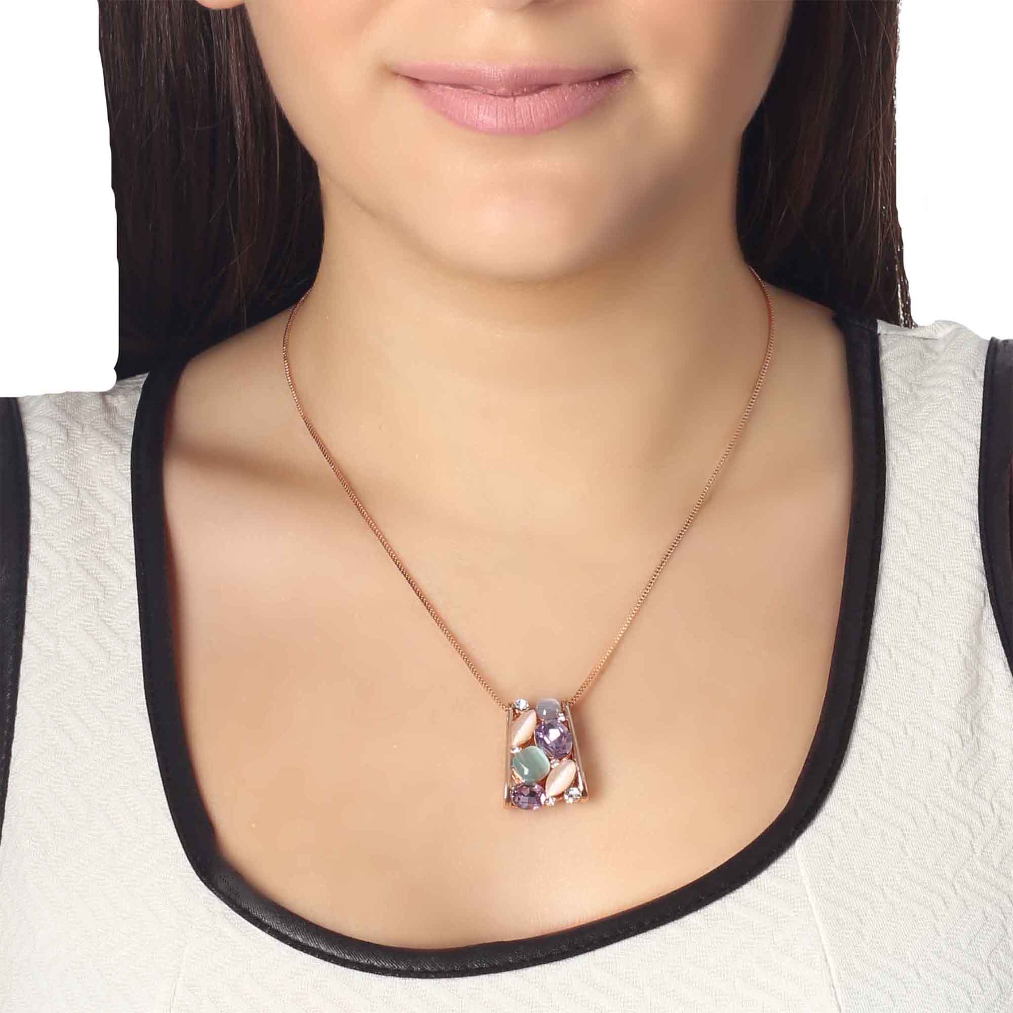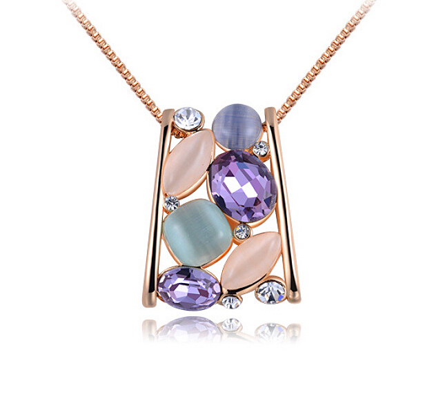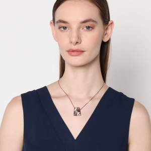 Dije en baño de oro rosa de 18 quilates, fino diseño con incrustaciones de cristales en color blanco y morado, con piedras preciosas. Fabricado en una estructura de aleación de platino con rodio sin níquel.