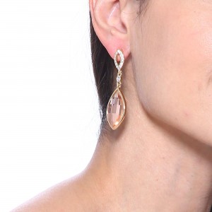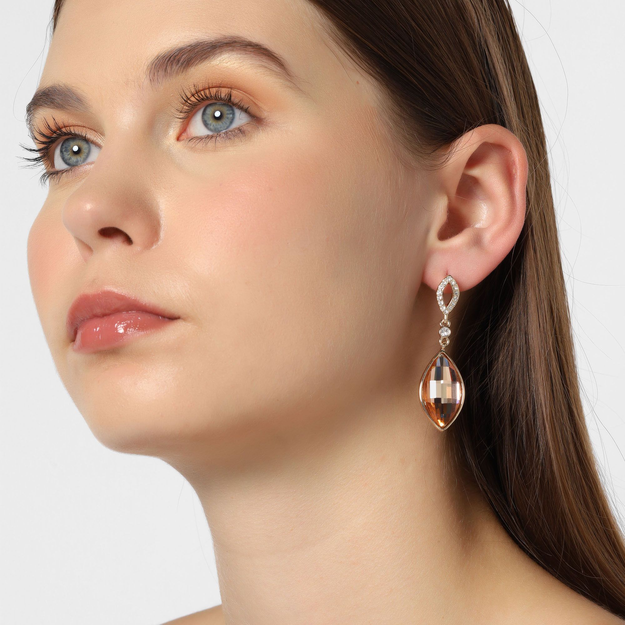 Elegantes aretes en baño de oro amarillo de 18 quilates, con exquisito diseño, cristal forma de gota color ámbar e incrustaciones de cristales blancos. Fabricado en una estructura de aleación de platino con rodio sin níquel.