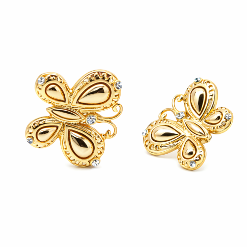 Originales aretes en baño de oro amarillo de 18 quilates con forma de mariposa, detalles en relieve con incrustaciones de cristales blancos. Fabricado en una estructura de aleación de platino con rodio sin níquel.