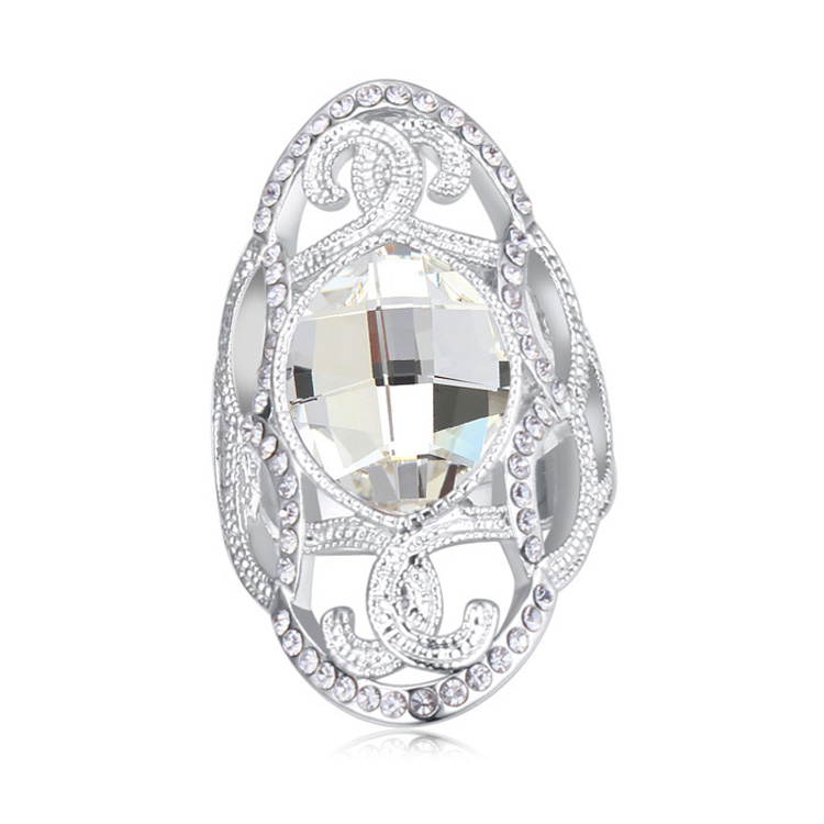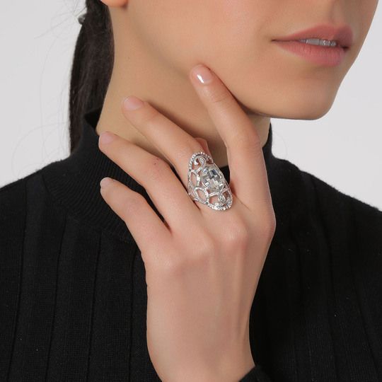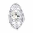 Hermoso anillo en baño de oro blanco de 18 quilates , diseño ovalado, con grecas en relieve e incrustaciones de cristales en color blanco.