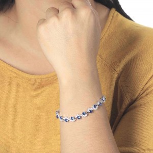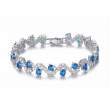 Elegante pulsera en baño de oro blanco de 18 quilates, diseño zig-zag con cristales en color blanco y azul. Fabricado en una estructura de aleación de platino con rodio sin níquel.