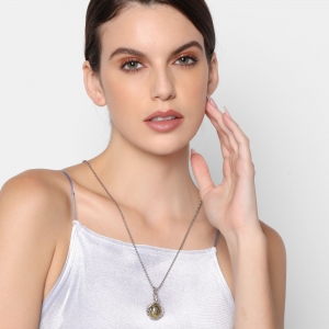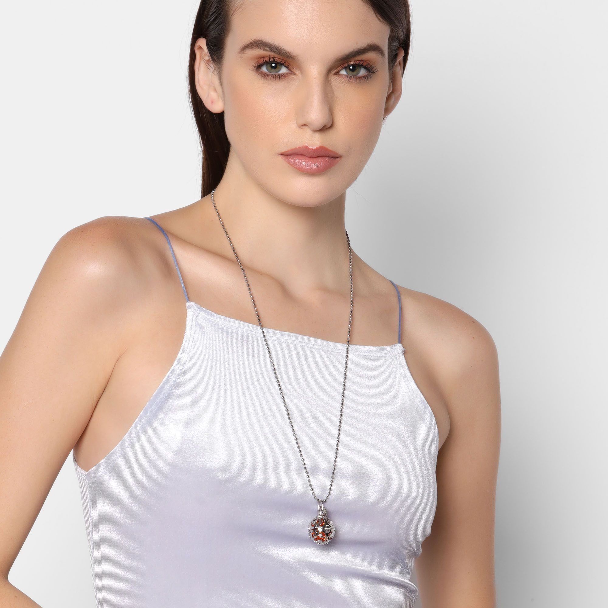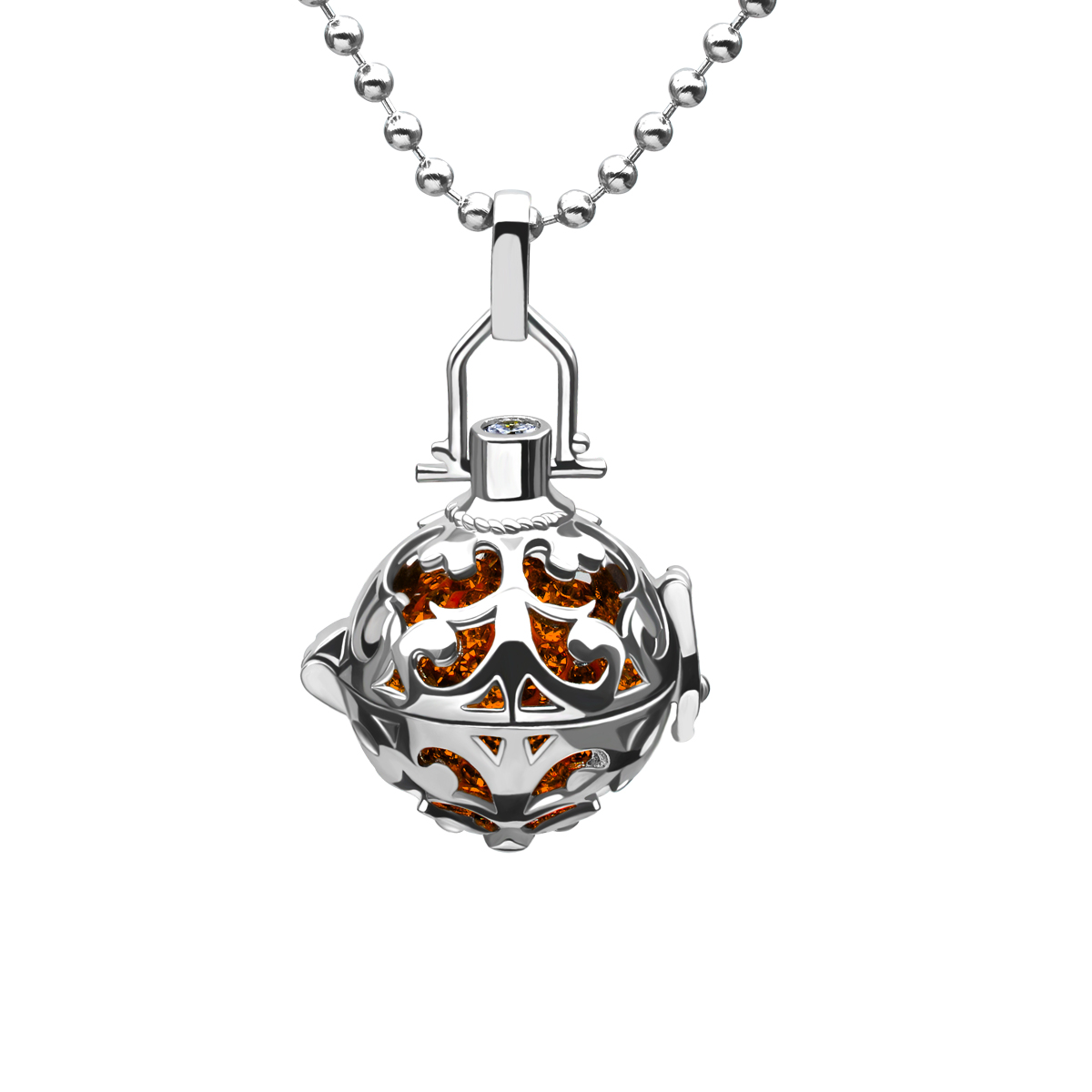 Llamador de acero inoxidable, diseño de grecas caladas, con esfera de color amarillo o naranja y broche de presión.