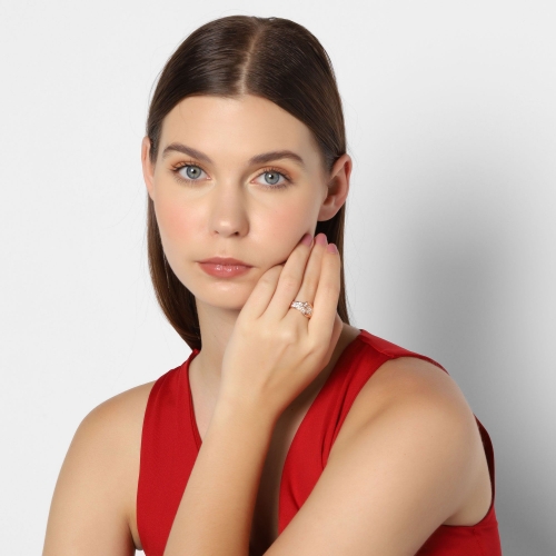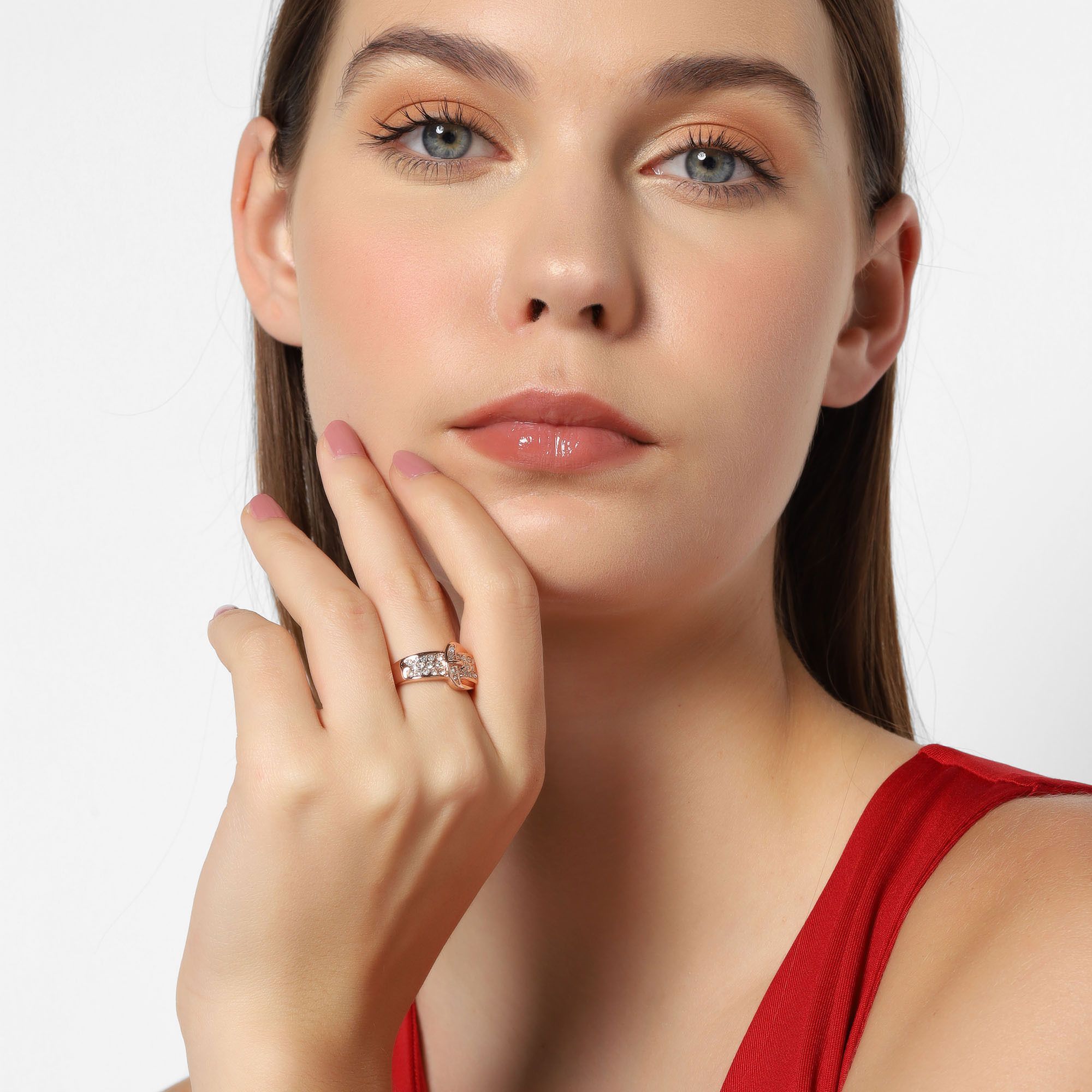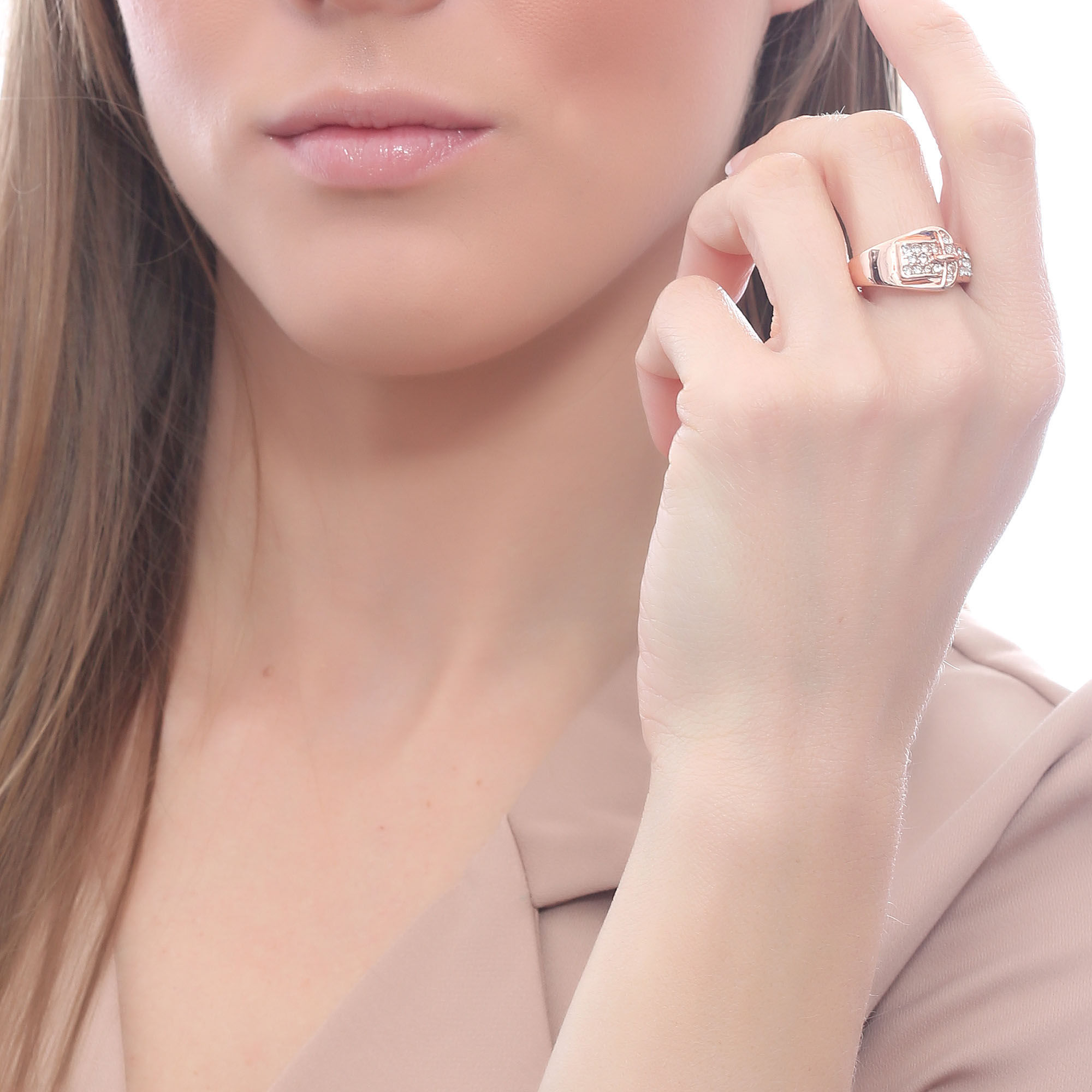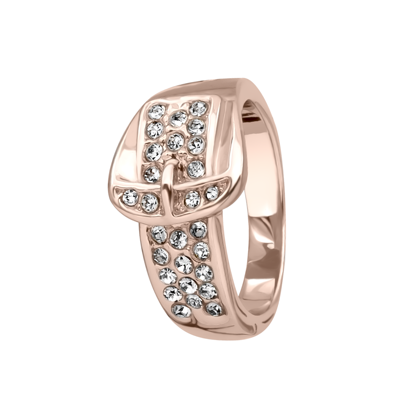 Lindo anillo en baño de oro rosa de 18 quilates , diseño de cinturón con incrustaciones de cristales en color blanco. Fabricado en una estructura de aleación de platino con rodio sin níquel.