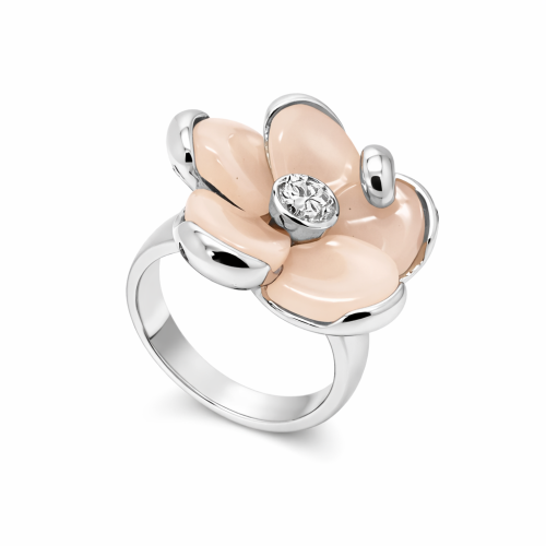 Lindo anillo, en baño de oro blanco de 18 quilates, diseño de flor, con pétalos de cristal rosa pálido e incrustaciones de cristales blancos. Fabricado en una estructura de aleación de platino con rodio sin níquel.