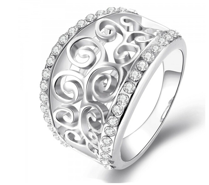 Anillo en baño de oro blanco de 18 quilates , diseño de espirales con incrustaciones de cristales en color blanco.