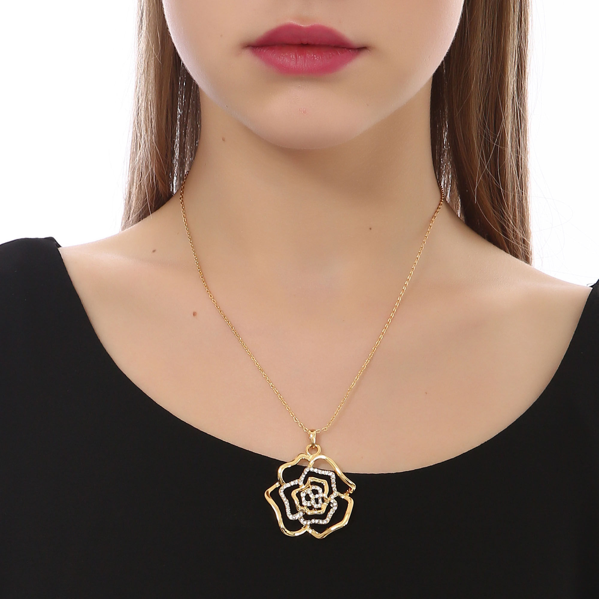 Dije en baño de oro amarillo de 18 quilates, diseño de flor con incrustaciones de cristales en color blanco. Fabricado en una estructura de aleación de platino con rodio sin níquel.