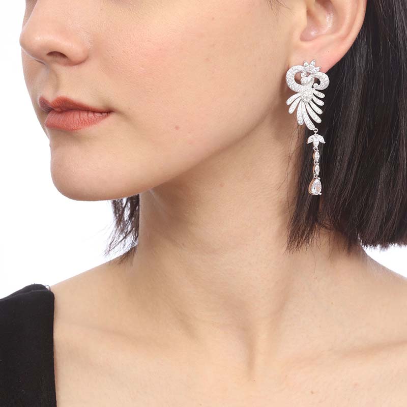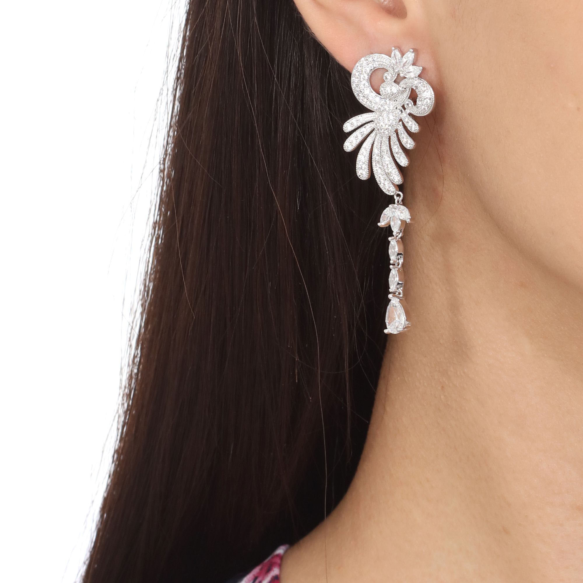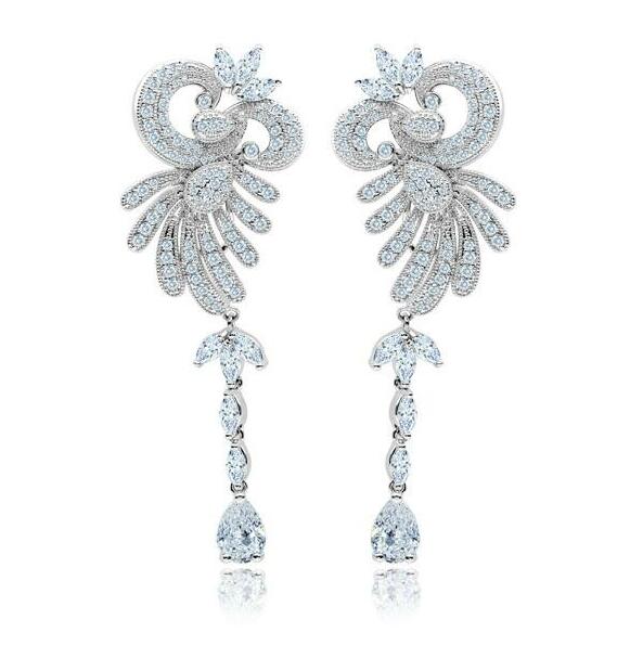 Aretes en baño de oro blanco de 18 quilates, fino diseño con incrustaciones de cristales en color blanco. Fabricado en una estructura de aleación de platino con rodio sin níquel.